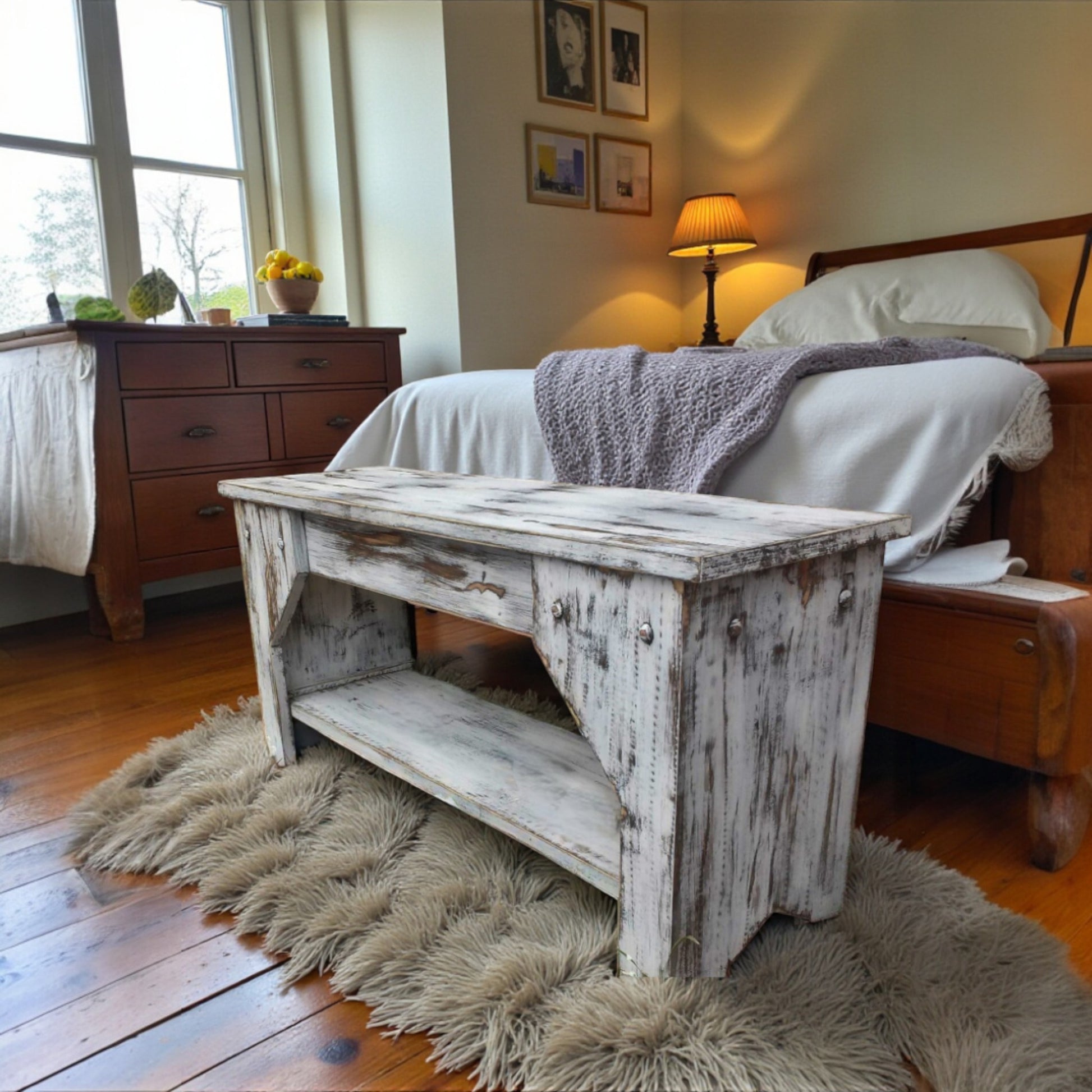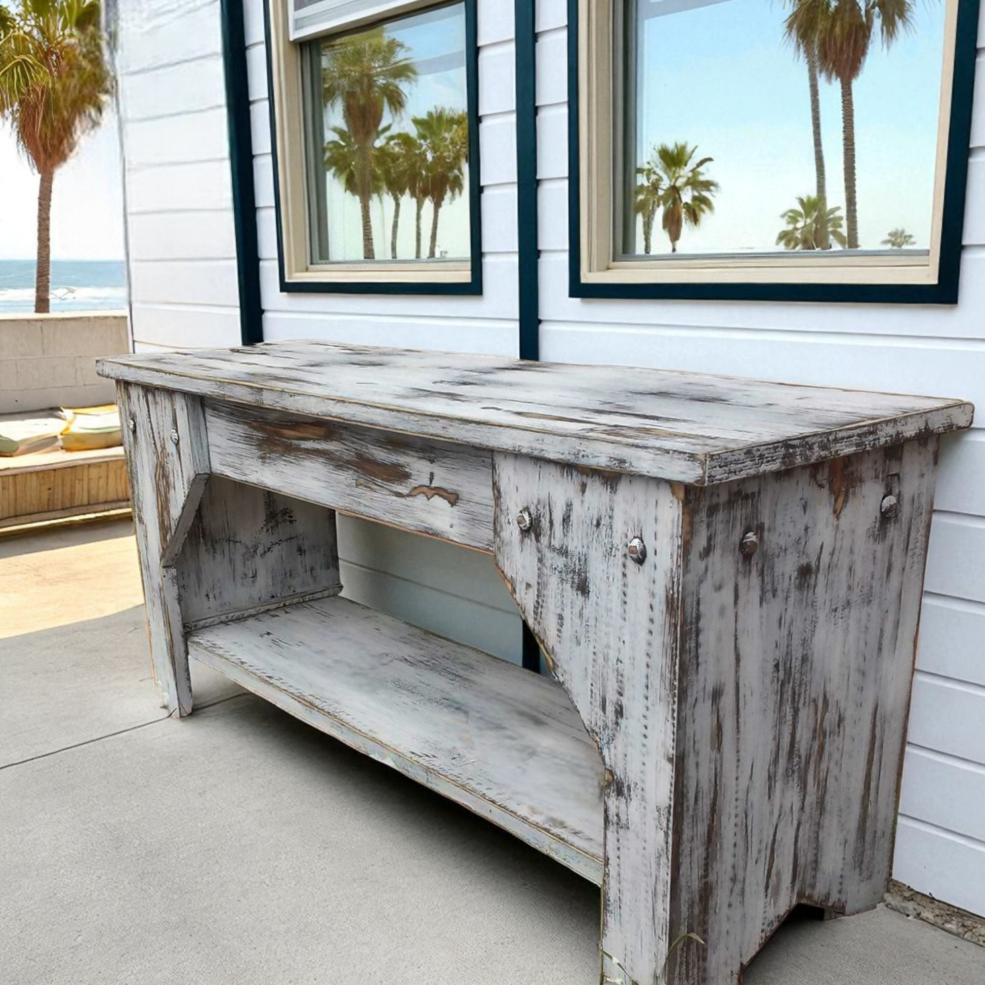 Simple wooden bench with a lot of rustic, weathered style! The extra distressed white over brown finish adds a beautiful touch to a beach house entry, a country mudroom or at the foot of a bed. Fits nicely with casual primitive or tropical style decor.